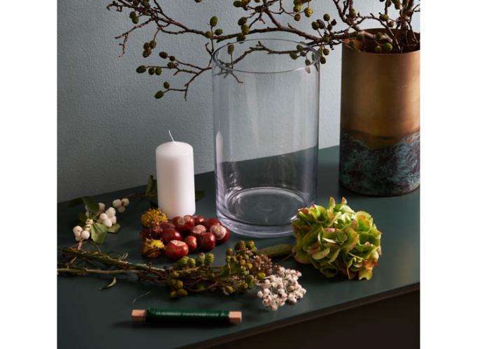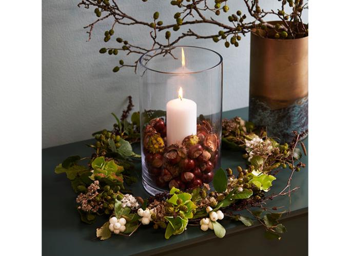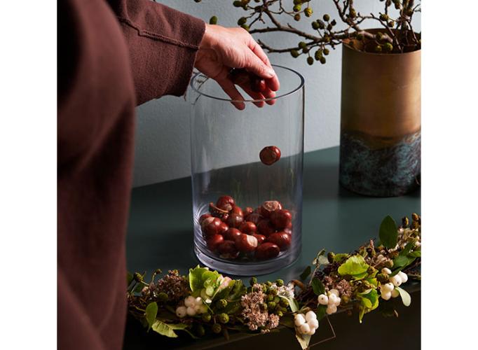 Du kan med få virkemidler gøre dine store glaskrukker ekstra dekorative. Pynt f.eks. med kastanjer og et bloklys. Et enkelt og smukt syn på skænken eller på spisebordet. På få minutter kan du pynte op til når du får gæster – eller når du bare vil nyde hverdagen.